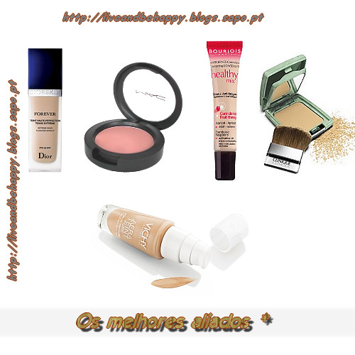 ♦ Base/Fond de teint - para além de uniformizar a pele, transparece um efeito de "máscara". Existem diversas, em tons diferentes e com determinadas qualidades, para que possas escolher a ideal para o teu tipo de pele, sendo que deves espalhar uma pequena dose (só mesmo uma pequena dose, evitem abusar, porque para além de ficares laranja, ficas com um aspecto artificial e acreditem que é muito feio) na testa, no nariz e no queijo, espalhando de dentro para fora com as pontas dos dedos ou com o auxilio de uma esponja.