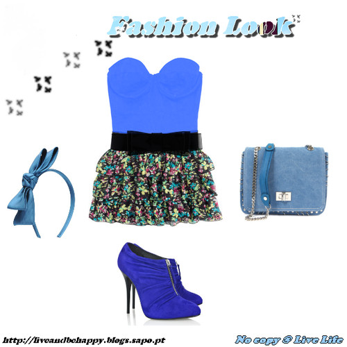 Ora, este look é em tons de azul e poderá parecer mais complexo do que o anterior, mas é extremamente fashion e feminino. É constituído, mais uma vez por uma saia com um padrão florido, por um corpete e por uns bottins; em termos de acessórios, temos uma carteira e um arco que irá transmitir uma leveza ao look em si.